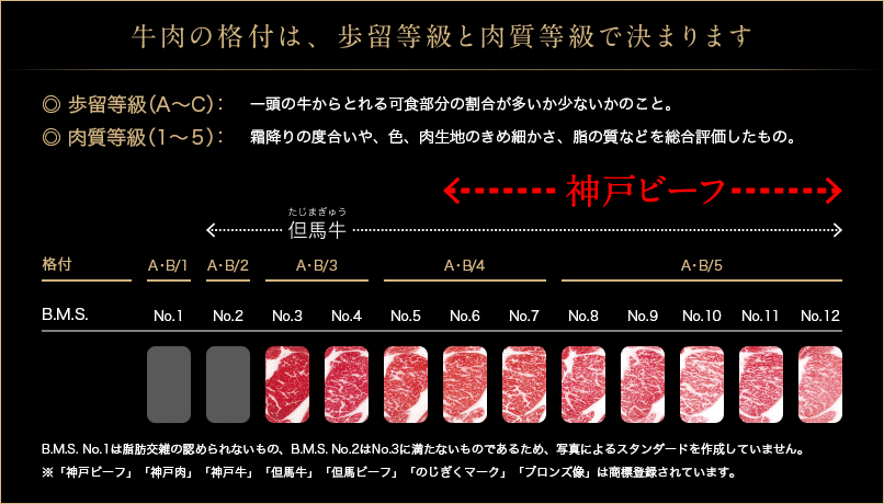 肉質等級は、お肉の「おいしさ(品質)」を総合的に評価する基準です。霜降りの入り具合(サシ)、肉の色、肉のきめ細かさ、そして脂の質などが細かくチェックされます。そして特に重要なのが「BMS値」です。これは「ビーフ・マーブリング・スタンダード」の略で、お肉の中にきめ細かく入っている霜降り(サシ)の度合いを示します。No.1からNo.12まであり、数字が大きいほど美しい霜降りが入っていることになります。「神戸ビーフ」には、No.6以上という霜降りが求められます。この美しい霜降りこそが、神戸ビーフの「とろけるような口どけ」を生み出す秘密なんです。