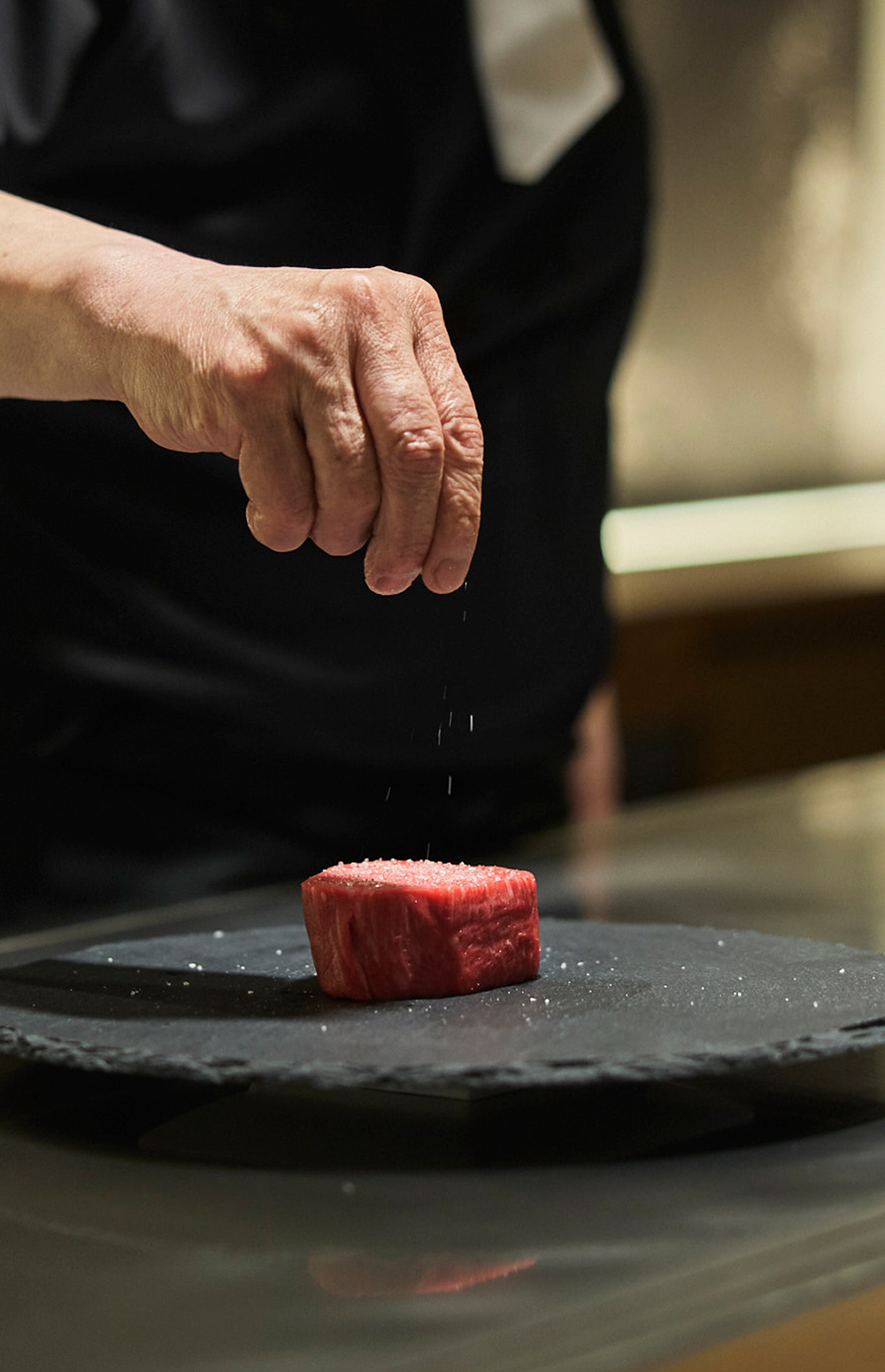 希少性、徹底した流通管理、そしてブランドにふさわしい肉の仕立て――それらを象徴するように、信頼の証である“のじぎく”の認証印が輝きます。「料理人としても誇りを持ってお出しできる、選ばれた肉だけがこのカウンターに立つのです」。