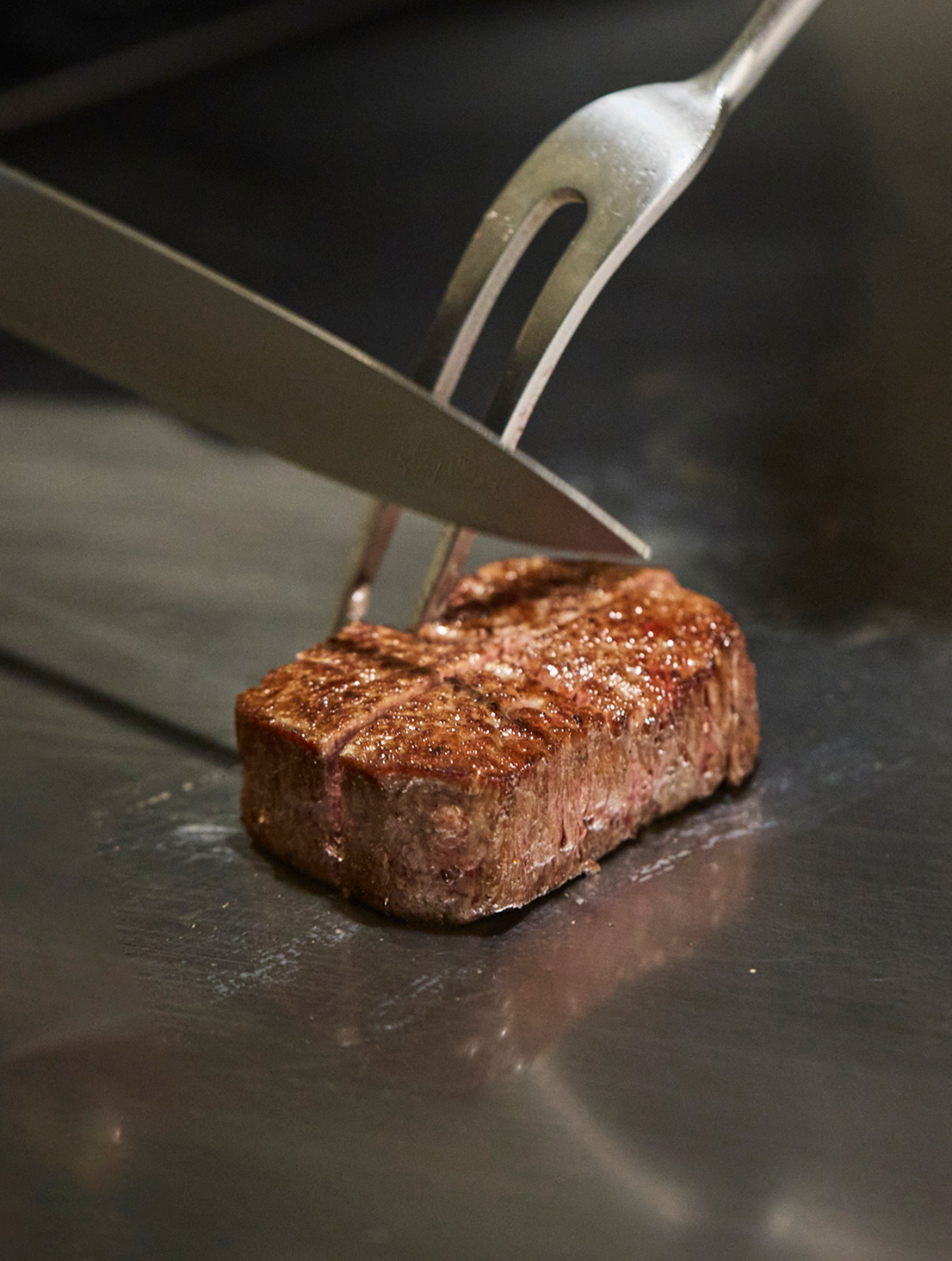 神戸ビーフの魅力は、まずその香りに現れます。芳醇でありながら、どこまでも上品。“肉を食べている”という確かな充足感を伴いながらも、脂の甘みが軽やかに抜けていきます。そして口に入れた瞬間に舌の上でなめらかに溶け出し、旨みが濃厚に広がる、あの感覚。それが他の和牛とは一線を画す、神戸ビーフの魅力です。「サシが細かく、繊細に入っているからこそ、焼いたときに立ち上がる香りがまるで違うんです。いい肉は、色づきも早い。火の入りも香りも見た目も、すべてが一瞬で決まります」。鉄板の温度を見極め、火の入りを見届ける。そして一瞬の“間”で火を止める。その一連の工程には、「素材を邪魔しない」という強い意志が込められています。